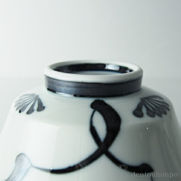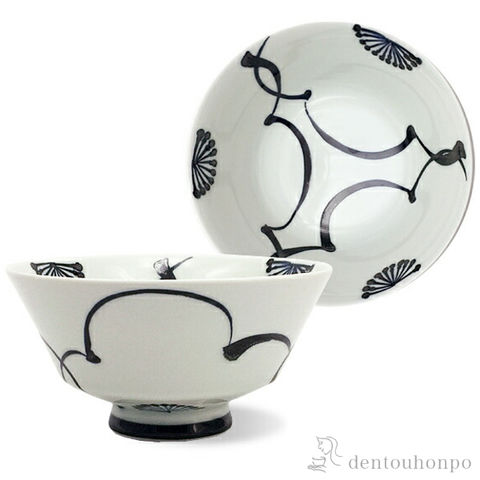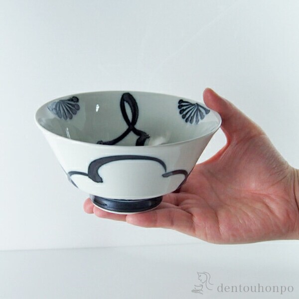 扇子の様な末広がりな形には、広がり栄える意味が込められています。器の内外には、江戸時代の人々が好んで身に付けた3種の縁起柄が描かれ、味わい深い佇まいです。大食の方や、育ち盛りにぴったりの大きいサイズのお茶碗。お茶漬けをする際にもたっぷり入ります。小さめの丼としてもおすすめです。