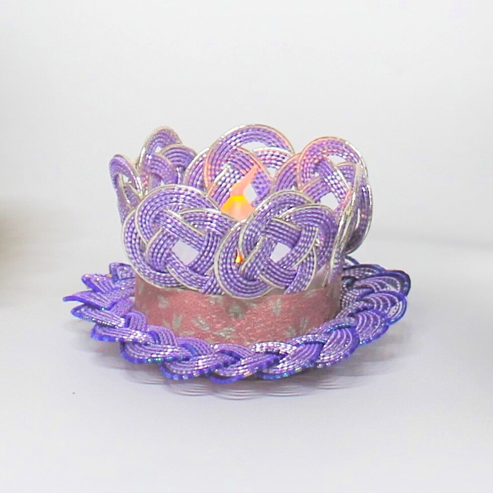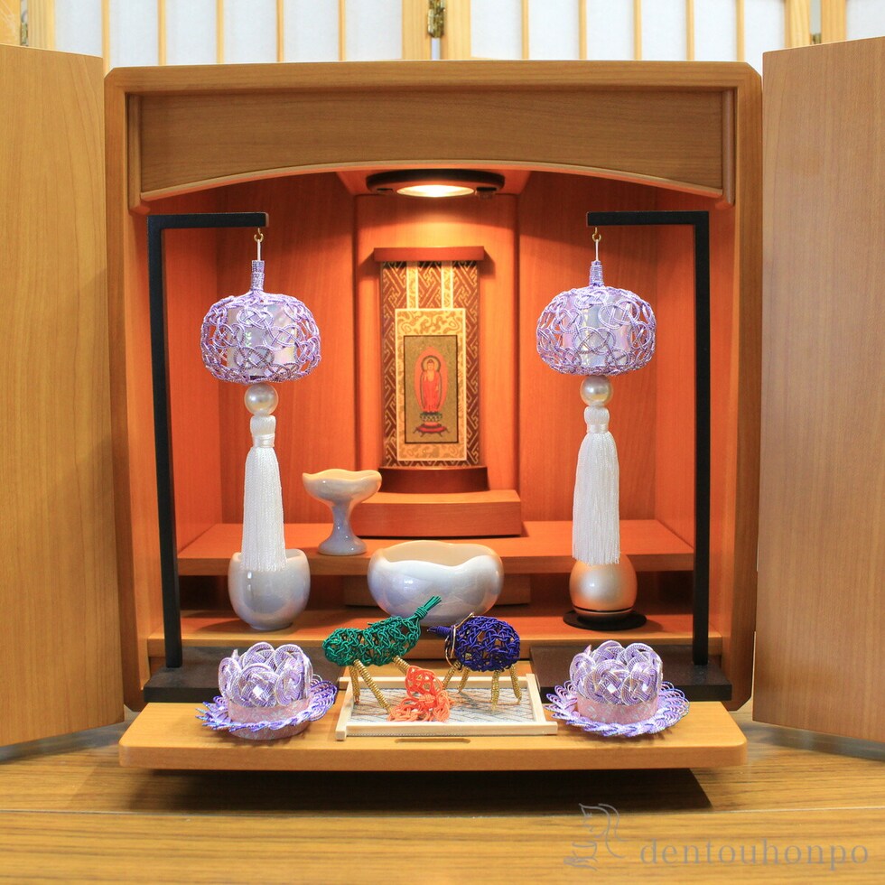 手結びの水引で仕上げた、現代の暮らしに寄り添うコンパクトな盆提灯(一対)。光が当たると中が美しく輝き、ご先祖様を迎える空間を上品に彩ります。スタンド付きで省スペースに飾れ、収納も簡単です。手のひらサイズの小さな灯明(LEDのライトで倒れても安心な構造)と、可愛らしい牛馬の盆飾りもセットでお届け。ご先祖様の乗り物とされ、玄関や盆棚に飾って供養の気持ちを表します。現代の暮らしに合うコンパクトなサイズです。