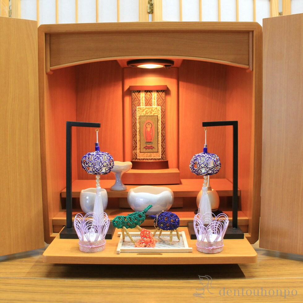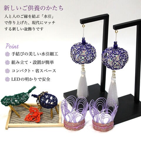 手結びの水引で仕上げた、現代の暮らしに寄り添うコンパクトな盆提灯(一対)。光が当たると中が美しく輝き、ご先祖様を迎える空間を上品に彩ります。スタンド付きで省スペースに飾れ、収納も簡単です。手のひらサイズの小さな灯明(LEDのライトで倒れても安心な構造)と、可愛らしい牛馬の盆飾りもセットでお届け。ご先祖様の乗り物とされ、玄関や盆棚に飾って供養の気持ちを表します。現代の暮らしに合うコンパクトなサイズです。