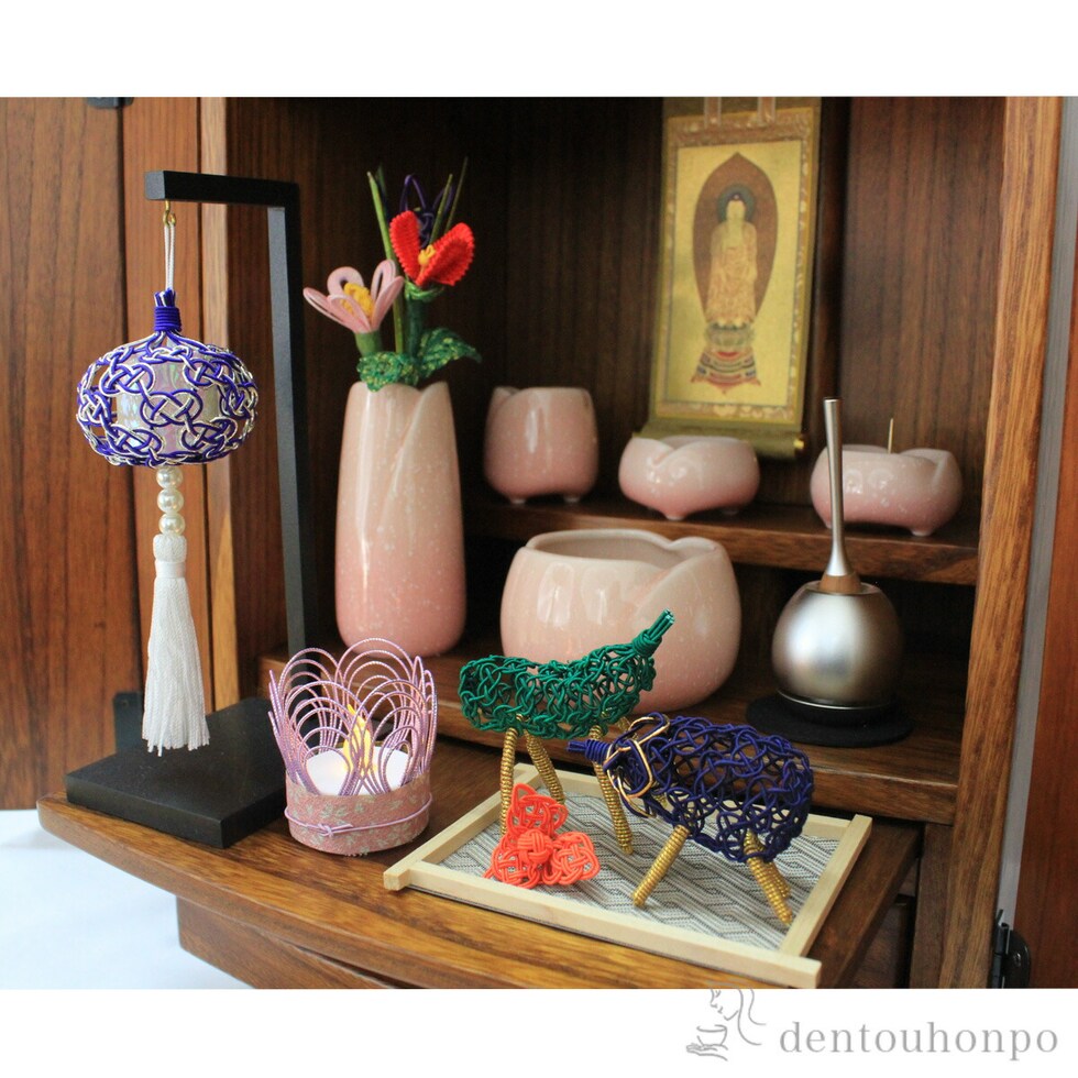 材質:[盆提灯] 本体:水引 [立台] 本体:木製 [灯明(LEDローソク)] 本体:水引、ローソク部分:LED、電源:リチウムボタン電池CR2032 [水引精霊牛馬 ホオズキ付(台を含む)] 精霊牛馬:水引、台:木製