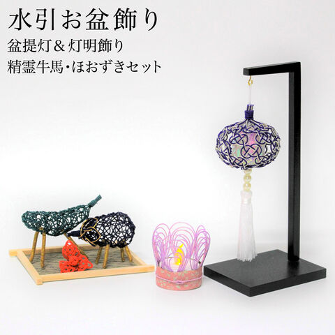 【飯田水引】 盆飾り 水引盆帰郷 盆提灯 小・LEDローソク 藍白 精霊牛馬・ほおずき セット 台付き