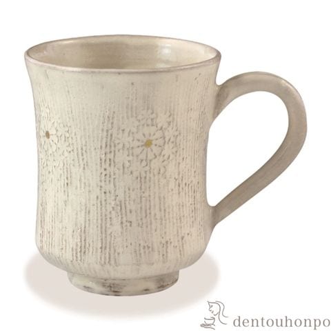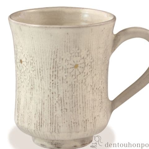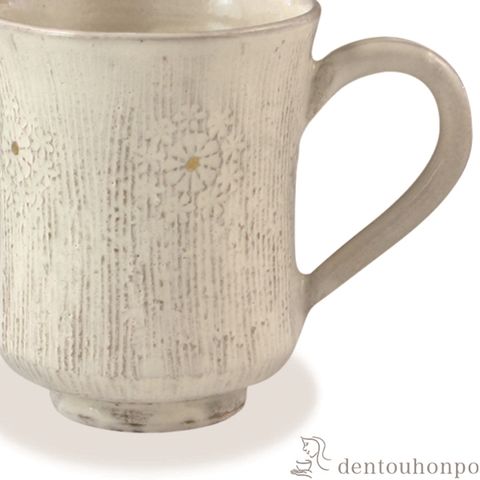 細かい櫛目模様に優しい印華紋が調和したお洒落なマグカップです。金彩の点が華やかさを添えています。