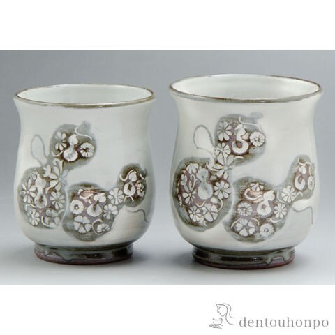 粉引の素地に印華で花紋や瓢箪を表現しています。六つの瓢箪で無病息災を表した縁起の良い湯呑です。