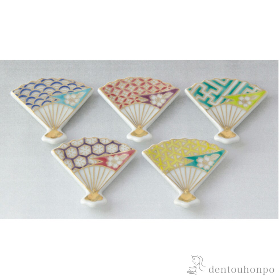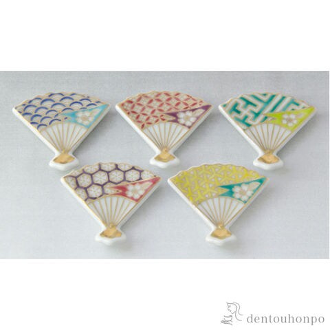 金彩で描いた桜と小紋に色とりどりの色絵があしらわれ、目が楽しい箸置きセットです。末広がりの扇は祝いの席に最適です。