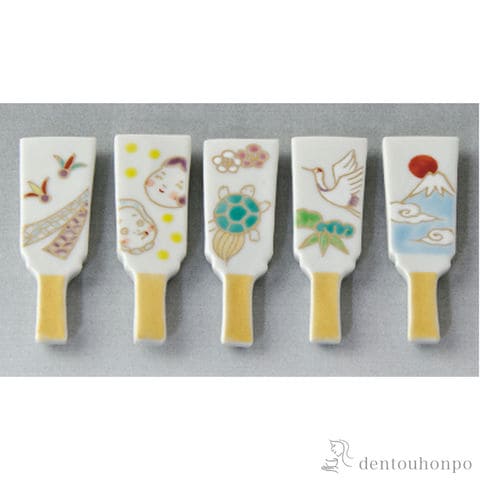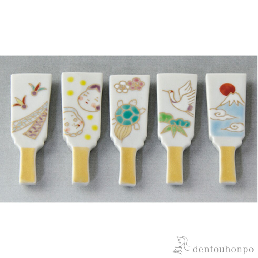 羽子板に鶴と松、亀と梅、初日の出と富士山、福笑いなど新春にまつわるモチーフを描いた縁起の良い箸置きセットです。