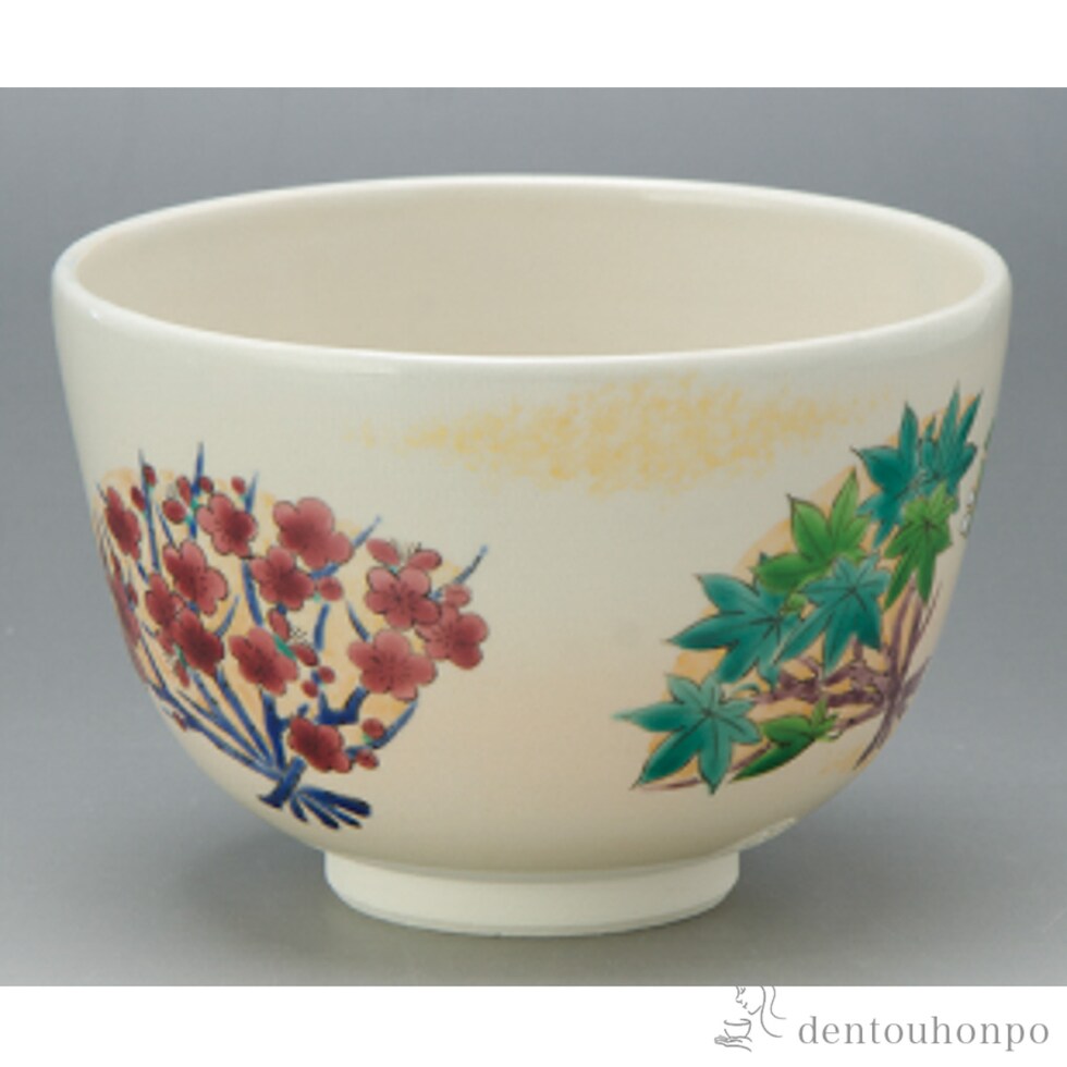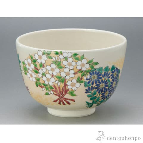 扇面四季草花 抹茶碗  ( 抹茶碗 茶道具 茶器 お稽古用 抹茶 清水焼 京焼 結婚 出産 内祝い 引き出物 金婚式 誕生日プレゼント 還暦祝い 古希 喜寿 米寿 )