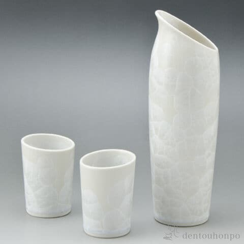 華やかな白の結晶釉とスタイリッシュな形のうつわが見事に調和しています。どんな席にもあう酒器です。