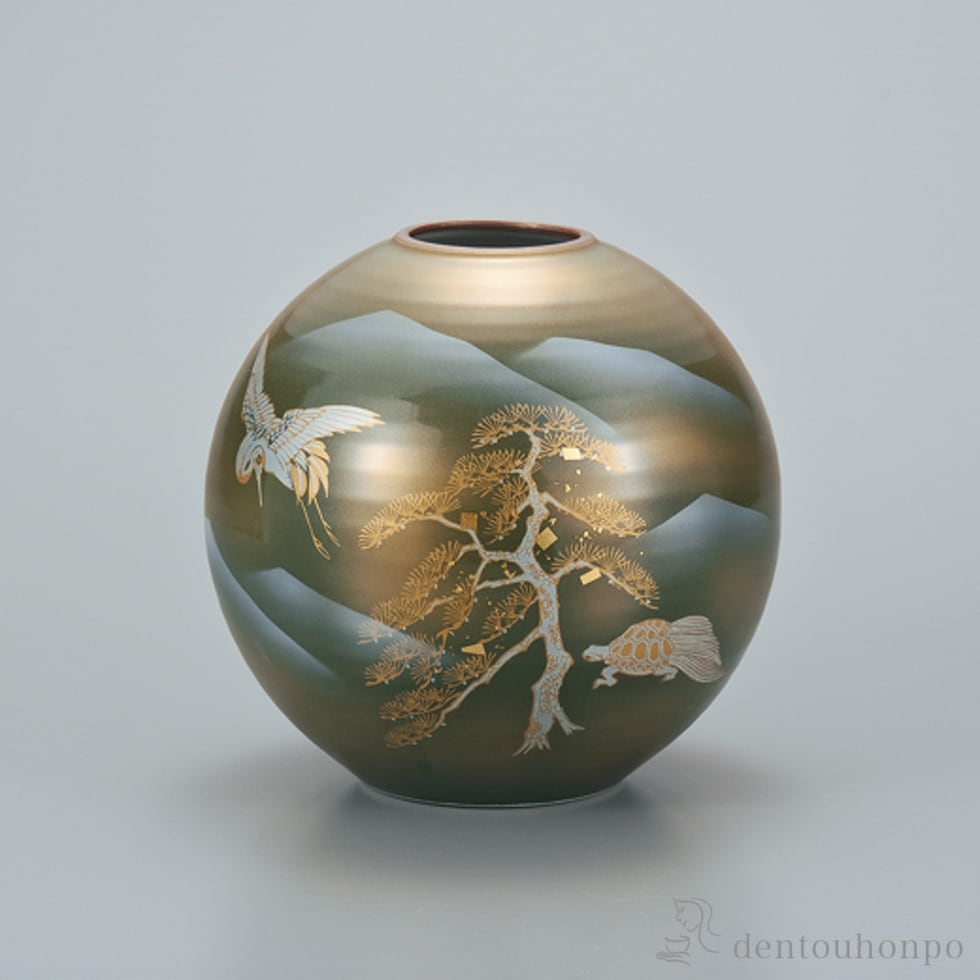 【九谷焼】 花瓶 鶴亀 7号