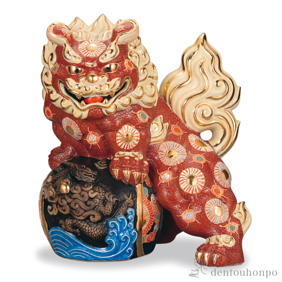 立龍彫刻獅子 盛 16号 ( 木札名入れ有料 置物 玄関 受付 風水 幸運 九谷焼 結婚 出産 内祝い 引き出物 金婚式 誕生日プレゼント 還暦祝い 古希 喜寿 )