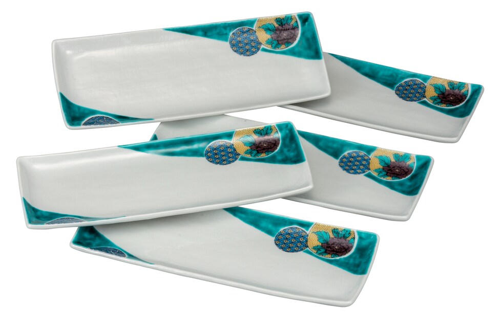 【九谷焼】 長皿揃 グリーン丸紋 10号