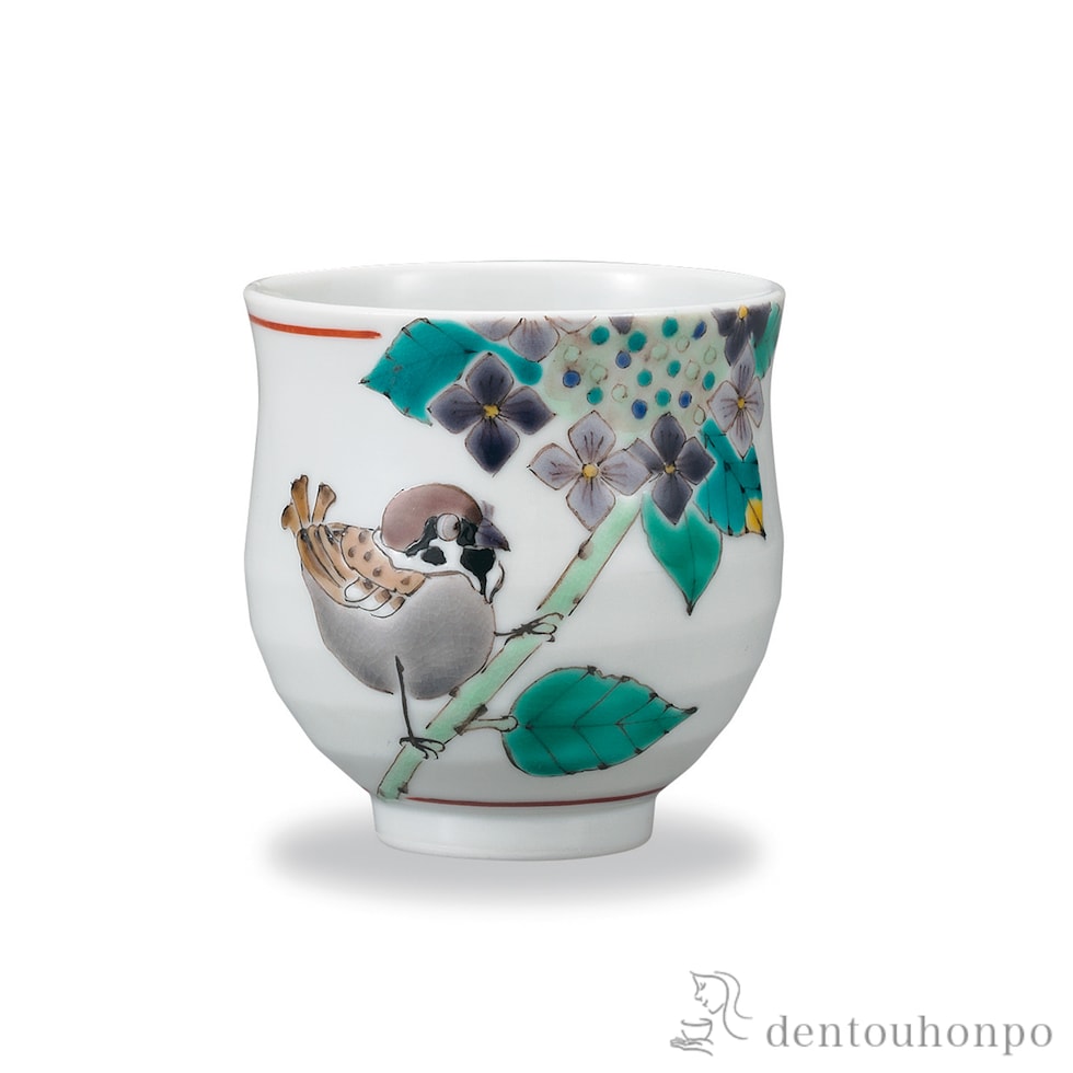 湯呑 額紫陽花に雀 ( 湯のみ ゆのみ 湯飲み カップ プレゼント 九谷焼 結婚 出産 内祝い 引き出物 金婚式 誕生日プレゼント 還暦祝い 古希 喜寿 米寿 退職 )