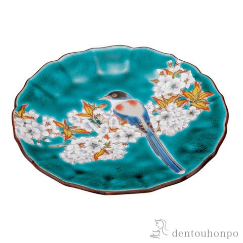 【九谷焼】 皿 グリーン山桜に鳥 4.5号