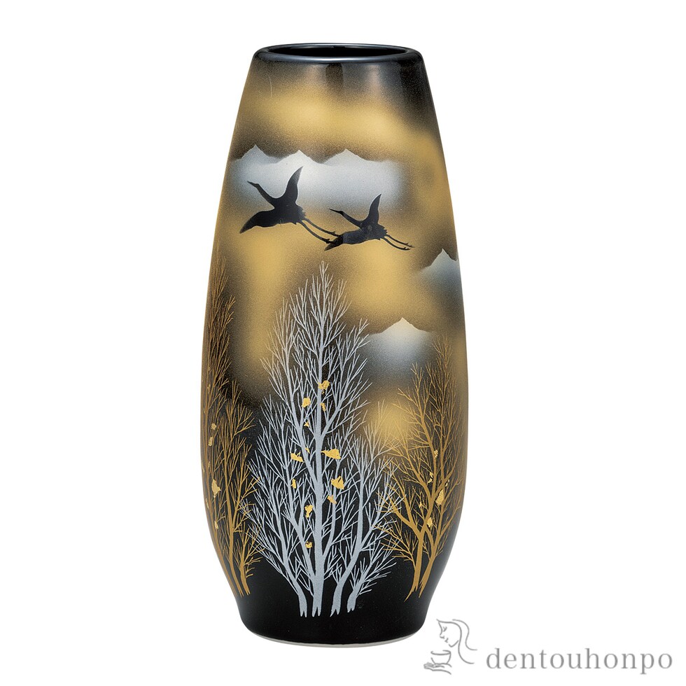 【九谷焼】 花瓶 金箔木立に双鶴 8.5号