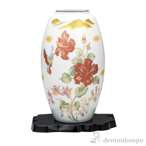 【九谷焼】 花瓶 ハイビスカスに鳥 9号 台付
