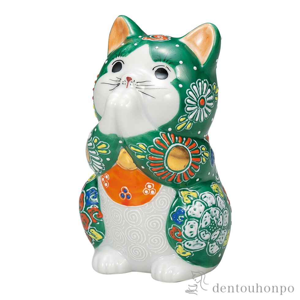 お祈り猫 緑盛 2.7号 ( 置物 幸運 開運 まねきねこ 風水 九谷焼 結婚 出産 内祝い 引き出物 金婚式 誕生日プレゼント 還暦祝い 古希 喜寿 米寿 退職 )