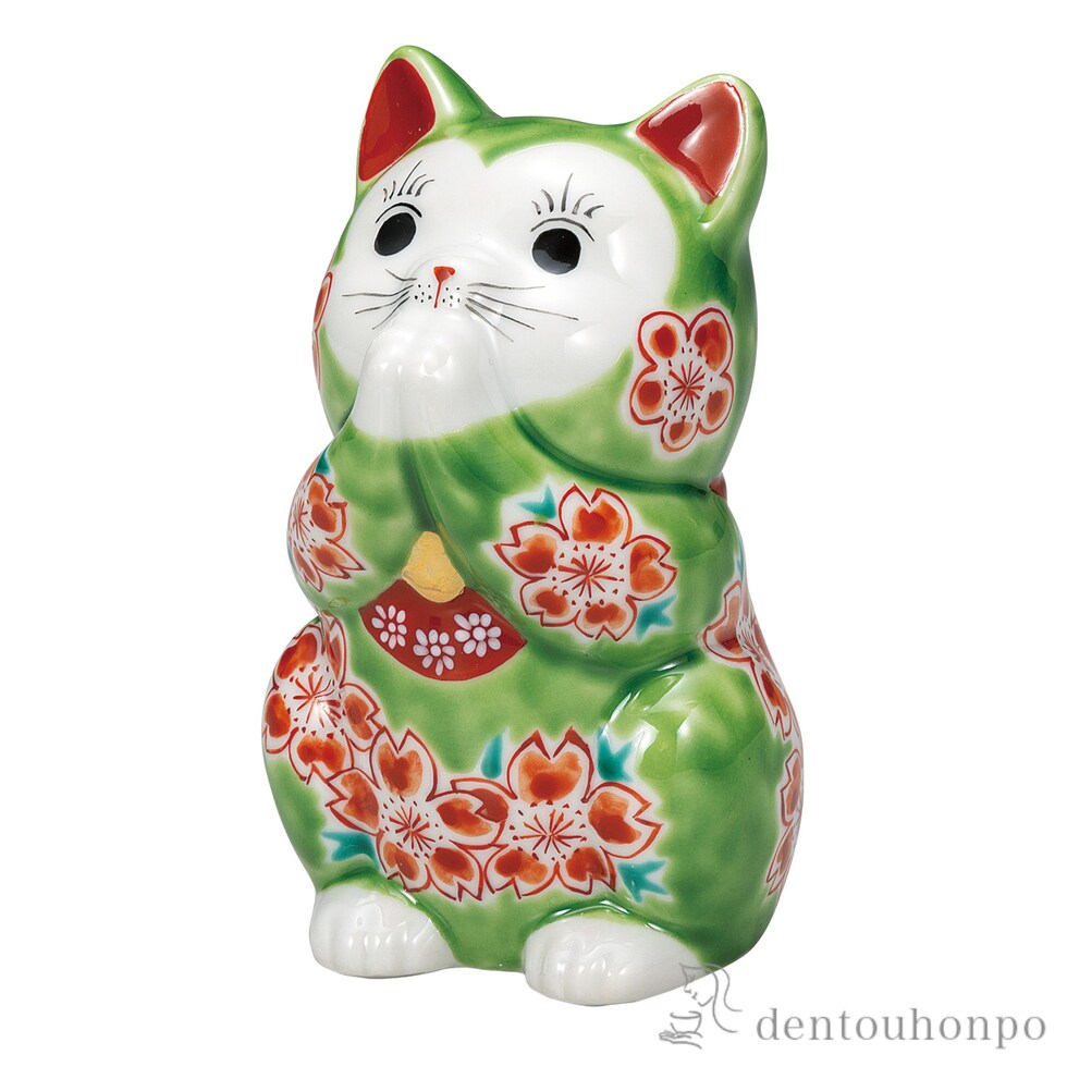 お祈り猫 グリーン釉桜 3.8号 ( 置物 幸運 開運 まねきねこ 風水 九谷焼 結婚 出産 内祝い 引き出物 金婚式 誕生日プレゼント 還暦祝い 古希 喜寿 米寿 退職 )