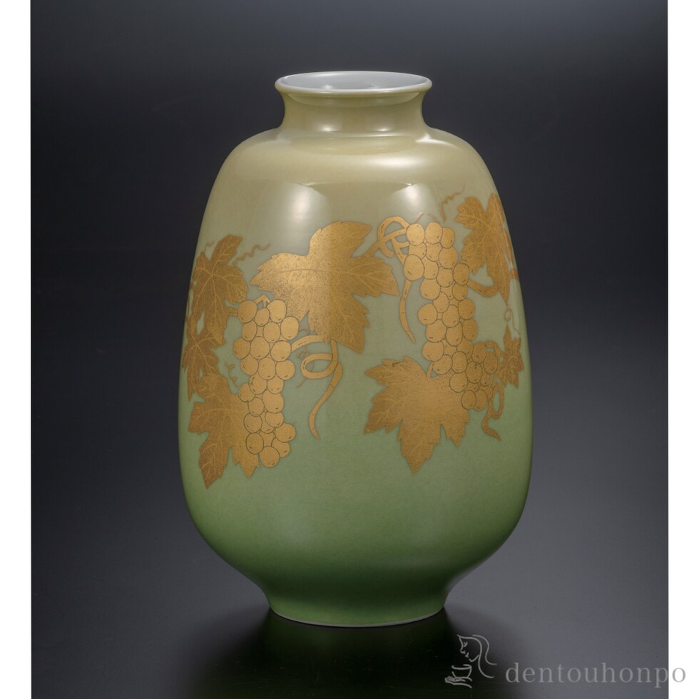 時を超えた美、九谷焼の釉裏金彩葡萄文花瓶。繊細な金彩が緑の釉薬を通して静かに輝き、上品な葡萄模様が品格を添えます。7.2号の存在感が和室にも洋室にも調和し、空間を格上げします。卓越した技術が生み出す一品を、お部屋の心地よいアクセントにどうぞ。