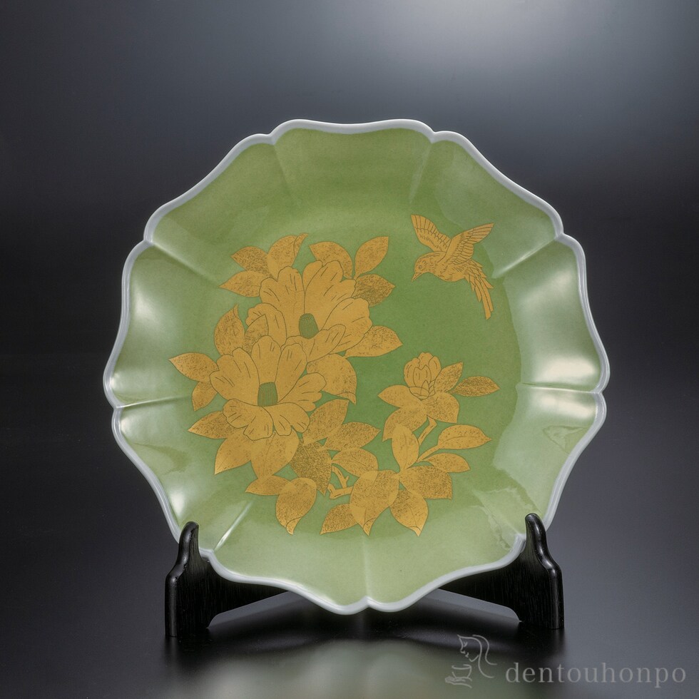 【九谷焼】 飾皿 釉裏金彩椿文 9.5号 皿立付