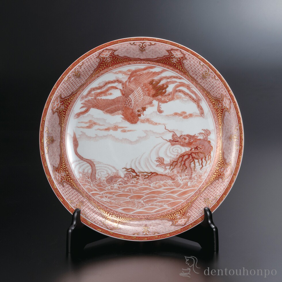 飾皿 赤絵細描龍鳳凰文 10号 皿立付 ( 置物 飾皿 スタンド 絵皿 贈り物 九谷焼 結婚 出産 内祝い 引き出物 金婚式 誕生日プレゼント 還暦祝い 古希 喜寿 )