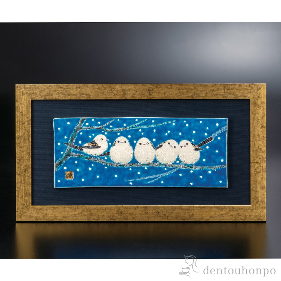 シーンとした冬の夜を舞台に、シマエナガたちが優雅に描かれた九谷焼の陶額。深みのあるブルーと繊細な彫釉彩で、心を落ち着かせる特別なひとときをお届けします。伝統工芸の美しさを感じるこの作品は、和の雰囲気を大切にした空間にぴったり。高級感ある佇まいで、贈り物にも最適です。