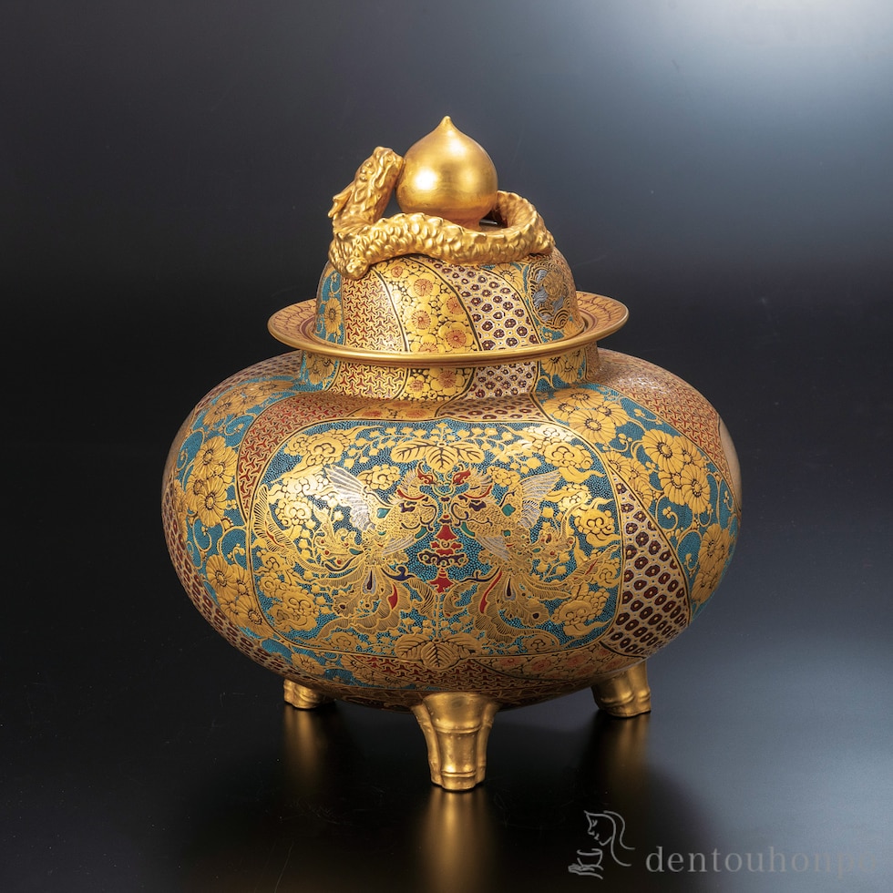 優雅な時を刻む九谷焼の香炉。本金盛割取小紋が織り成す華やかな曲線美で、格調高い空間を演出します。極上の風合いは日常に特別な一瞬を届け、あなたの心を豊かに潤すでしょう。洗練された美術品として、静謐なひとときを共にする贅沢を是非ご体感ください。
