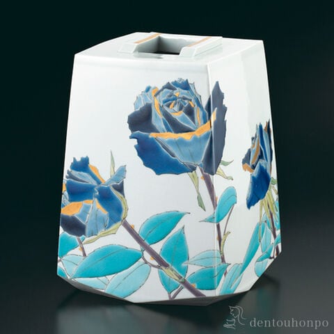 【九谷焼】 方壺 色絵薔薇「青玲」