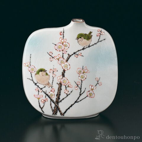 【九谷焼】 扁壺 梅にウグイス 4号