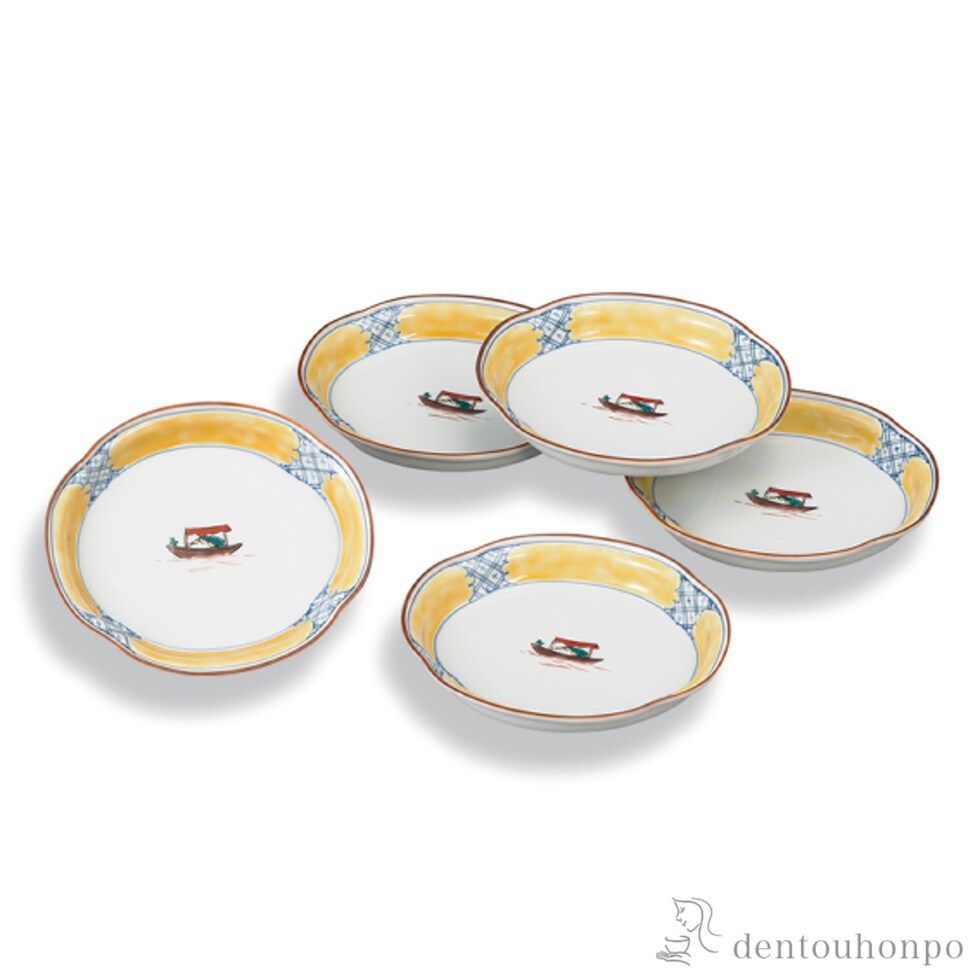 ツバ型皿揃 屋形船 5枚セット ( 和食器セット お皿 揃える 食器 和食 九谷焼 結婚 出産 内祝い 引き出物 金婚式 誕生日プレゼント 還暦祝い 古希 喜寿 )