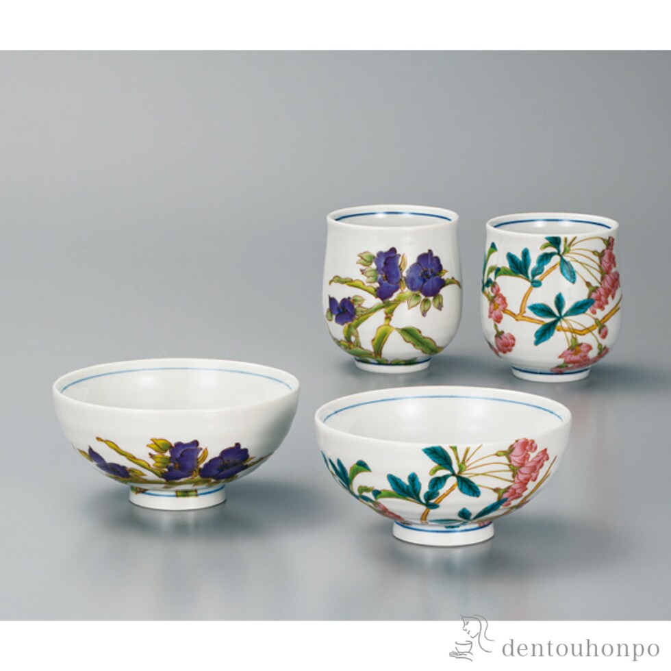 夫婦揃 花紋 ペアセット ( 夫婦茶碗 夫婦湯呑 セット ご飯茶碗 湯飲み 九谷焼 結婚 出産 内祝い 引き出物 金婚式 誕生日プレゼント 還暦祝い 古希 喜寿 米寿 )