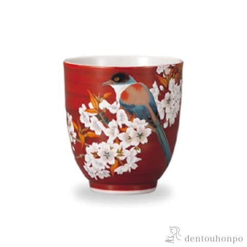 【九谷焼】 湯呑 赤地 山桜に鳥