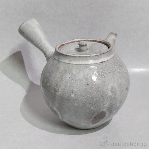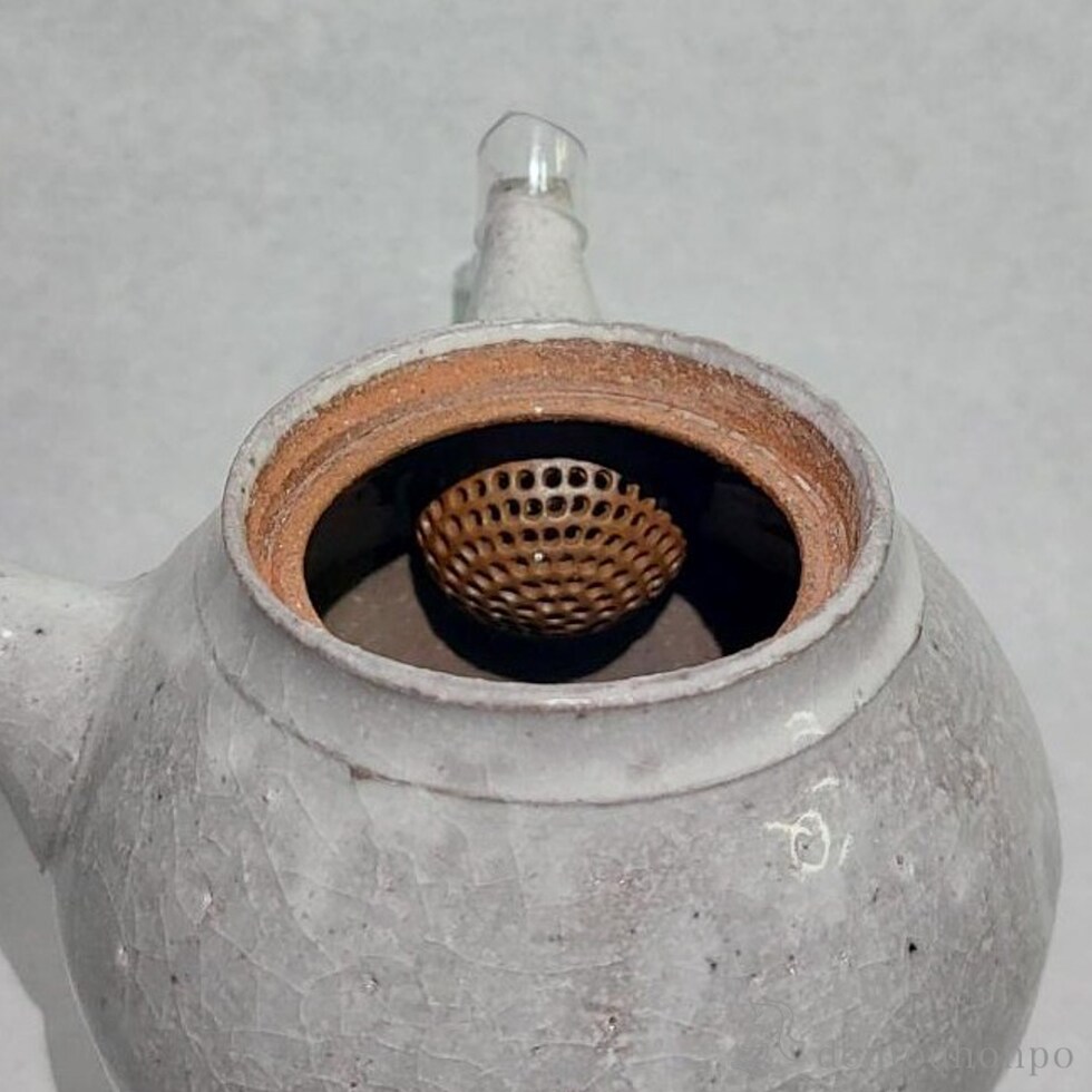 四日市萬古焼の伝統工芸士、山本太仙作の急須です。太仙の急須は手作りの雰囲気を残した温かみのあるフォルムが特徴的です。こちらの白後手急須は内面に透明釉を施しており、香りや色の付着が強い中国茶・紅茶でのご使用もおすすめです。茶漉しはステンレス製ではなく一個一個手作業で開ける伝統技法「共茶漉し」が使用されています。ステンレス製の茶漉しと比べて茶渋の付着による目詰まりも起こりにくく長く愛用いただけます。