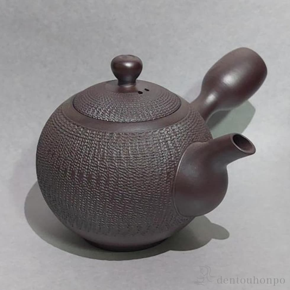 四日市萬古焼の伝統工芸士、舘正規作の急須です。正規の急須は一つ一つ轆轤で作ったとは思えない程の均一かつ精巧な造りで手に取る人を魅了します。陶土を主成分とし内面に釉薬を使用していない萬古焼急須は陶器・磁器のどちらでもなく「陶土器」になります。陶土器急須は土含まれる鉄分と茶葉の相性がいいので渋みを取りまろやかな味わいになることが特徴です。茶漉しはステンレス製ではなく一個一個手作業で開ける伝統技法「共茶漉し」が使用されています。ステンレス製の茶漉しと比べて茶渋の付着による目詰まりも起こりにくく長く愛用いただけます。