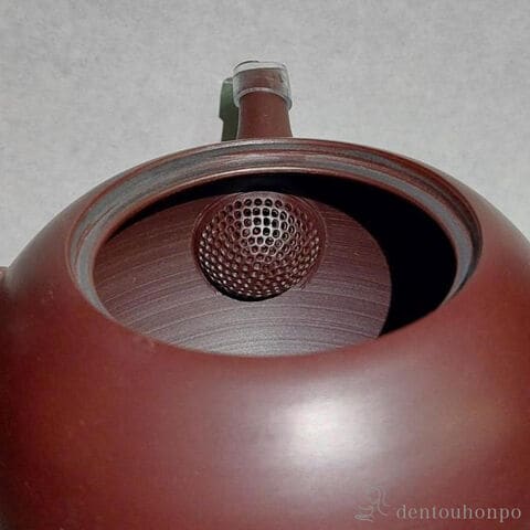 四日市萬古焼の伝統工芸士、伊藤実山作の急須です。実山の急須は土と手仕事の温もりを感じられる独特の光沢を放っています。陶土を主成分とし内面に釉薬を使用していない萬古焼急須は陶器・磁器のどちらでもなく「陶土器」になります。陶土器急須は土含まれる鉄分と茶葉の相性がいいので渋みを取りまろやかな味わいになることが特徴です。茶漉しはステンレス製ではなく一個一個手作業で開ける伝統技法「共茶漉し」が使用されています。透かし彫の技術を流用した実山本人による茶漉しの穴あけは細かな茶葉も濾せる精巧な茶漉しになっています。ステンレス製の茶漉しと比べて茶渋の付着による目詰まりも起こりにくく長く愛用いただけます。