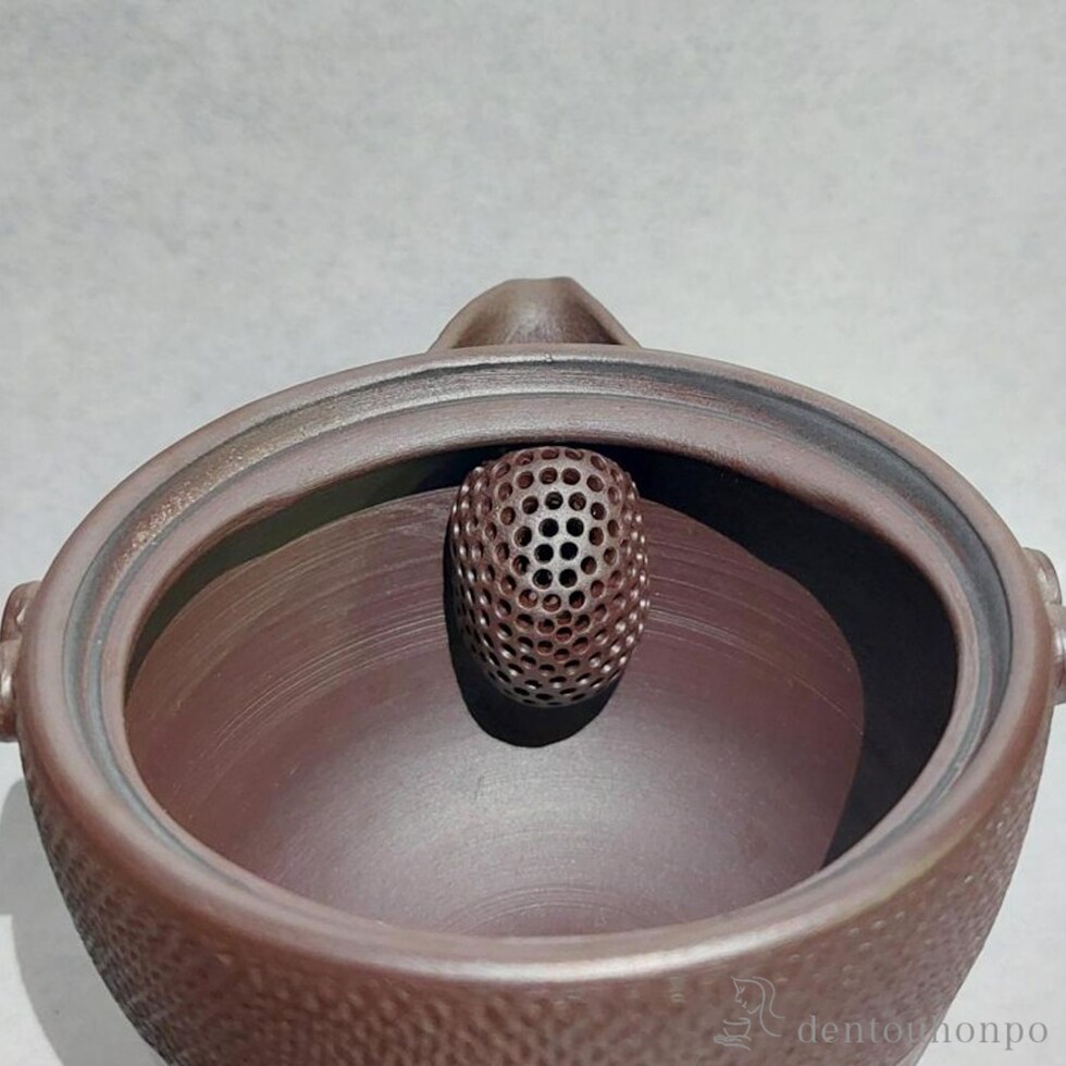 四日市萬古焼の伝統工芸士、四代目伊呂久作の泡瓶です。伊呂久の特徴でもある1枚1枚を手作業で削り取るダイヤカットが施されています。陶土を主成分とし内面に釉薬を使用していない萬古焼急須は陶器・磁器のどちらでもなく「陶土器」になります。陶土器急須は土含まれる鉄分と茶葉の相性がいいので渋みを取りまろやかな味わいになることが特徴です。茶漉しはステンレス製ではなく一個一個手作業で開ける伝統技法「ハリ茶漉し」が使用されています。ステンレス製の茶漉しと比べて茶渋の付着による目詰まりも起こりにくく長く愛用いただけます。持ち手が無い急須の泡瓶は低温でゆっくり蒸らして抽出するかぶせ茶や玉露での使用がおすすめです。