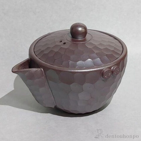 四日市萬古焼の伝統工芸士、四代目伊呂久作の泡瓶です。伊呂久の特徴でもある1枚1枚を手作業で削り取るダイヤカットが全面に施されている総ダイヤの泡瓶です。陶土を主成分とし内面に釉薬を使用していない萬古焼急須は陶器・磁器のどちらでもなく「陶土器」になります。陶土器急須は土含まれる鉄分と茶葉の相性がいいので渋みを取りまろやかな味わいになることが特徴です。茶漉しはステンレス製ではなく一個一個手作業で開ける伝統技法「ハリ茶漉し」が使用されています。ステンレス製の茶漉しと比べて茶渋の付着による目詰まりも起こりにくく長く愛用いただけます。持ち手が無い急須の泡瓶は低温でゆっくり蒸らして抽出するかぶせ茶や玉露での使用がおすすめです。