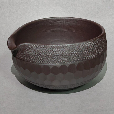 四日市萬古焼の伝統工芸士、四代目伊呂久作の絞り出しです。伊呂久の特徴でもある1枚1枚を手作業で削り取るダイヤカットが施されています。低温で飲むお茶の茶葉を抽出するためにお湯を冷ます道具です。陶土を主成分とし内面に釉薬を使用していない萬古焼は陶器・磁器のどちらでもなく「陶土器」になります。湯冷ましとしてだけでなく淹れたお茶を湯呑に注ぎ分ける前に入れる茶海としてもご使用いただけます。