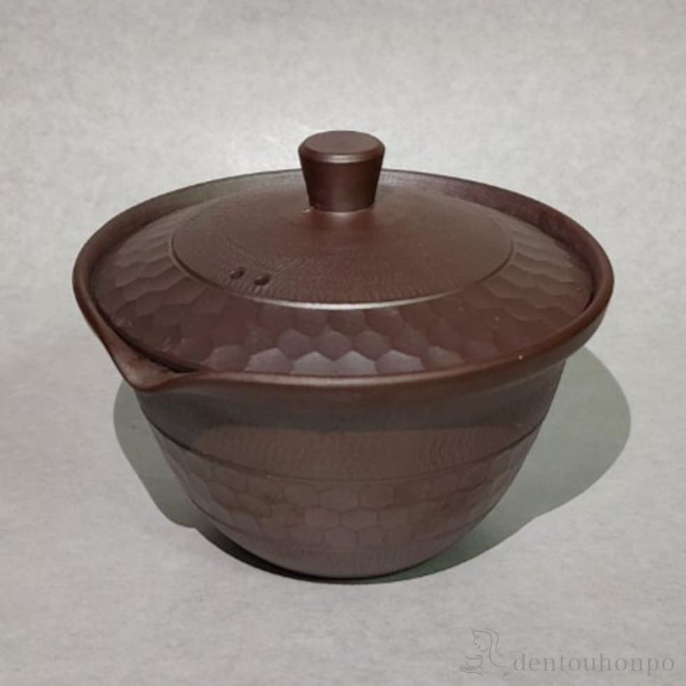 四日市萬古焼の伝統工芸士、四代目伊呂久作の絞り出しです。伊呂久の特徴でもある1枚1枚を手作業で削り取るダイヤカットが施されています。陶土を主成分とし内面に釉薬を使用していない萬古焼急須は陶器・磁器のどちらでもなく「陶土器」になります。陶土器急須は土含まれる鉄分と茶葉の相性がいいので渋みを取りまろやかな味わいになることが特徴です。持ち手が無い急須の絞り出しは低温でゆっくり蒸らして抽出するかぶせ茶や玉露での使用がおすすめです。