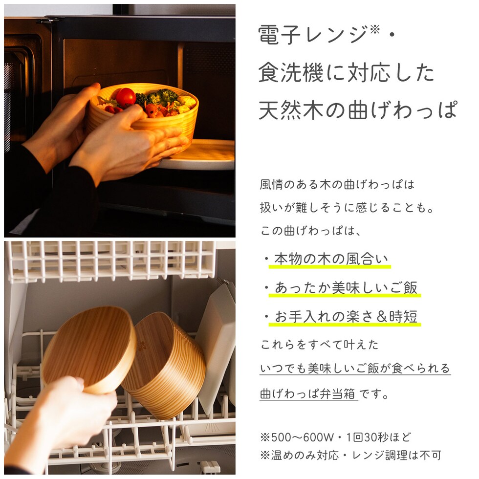 天然木製品でありながら電子レンジ&食洗機が使える「曲げわっぱ」。木の調湿機能でお米がべちゃつかず、美味しく食べられます。お昼にはレンジで温めたあったかごはんを。夜は食洗機でお手入れを簡単に。山中漆器の産地で、漆塗りの塗師屋(ぬしや)として培った仕上げ技術で、見た目の満足感と使いやすさを両立した曲げわっぱ弁当箱です。