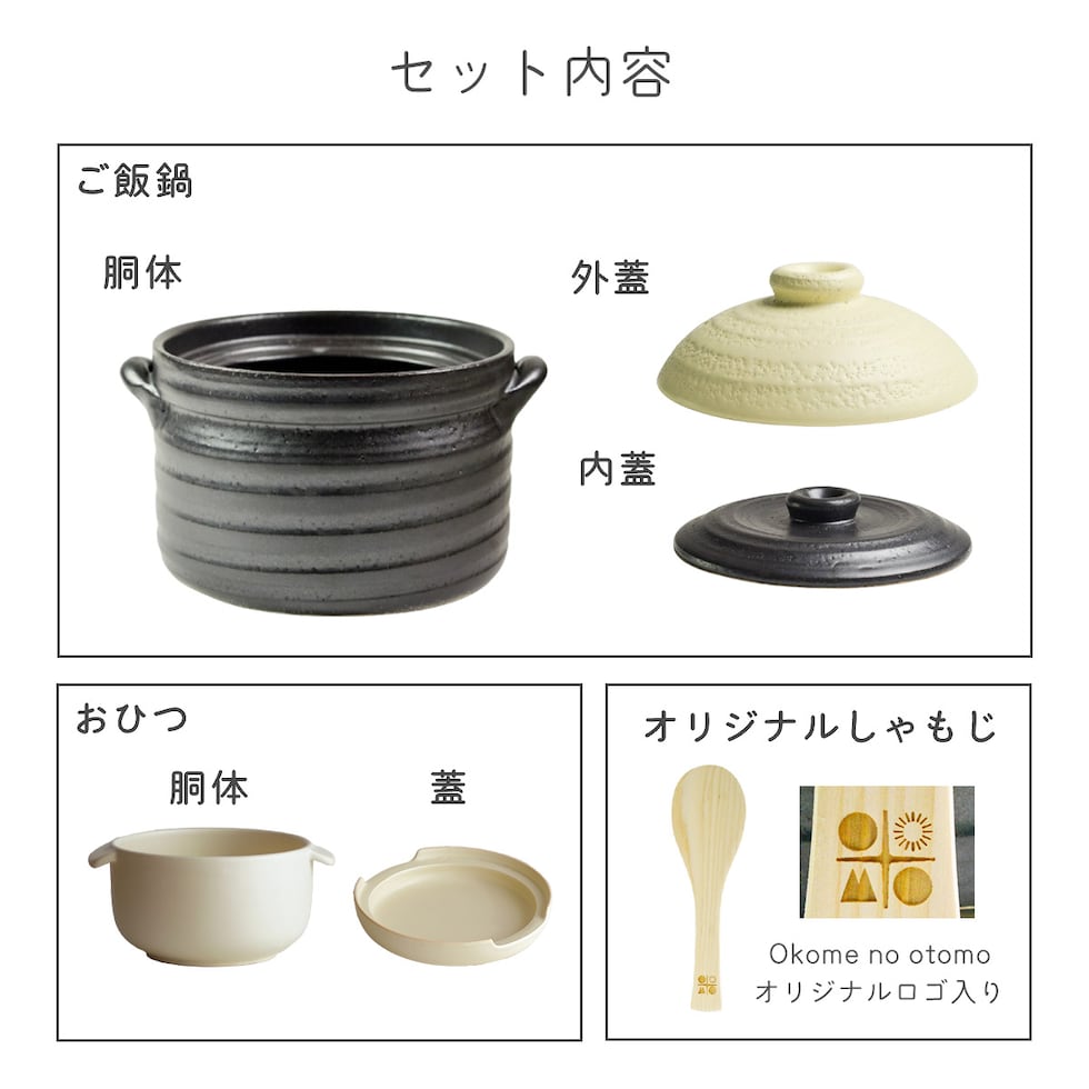 IH対応 ご飯鍋 3合炊き & おひつ 1合用 Okome no otomo セット オリジナルしゃもじ付き ( ごはん鍋 炊飯土鍋 土鍋ご飯 ご飯釜 陶器 保存容器 日本製 萬古焼 )
