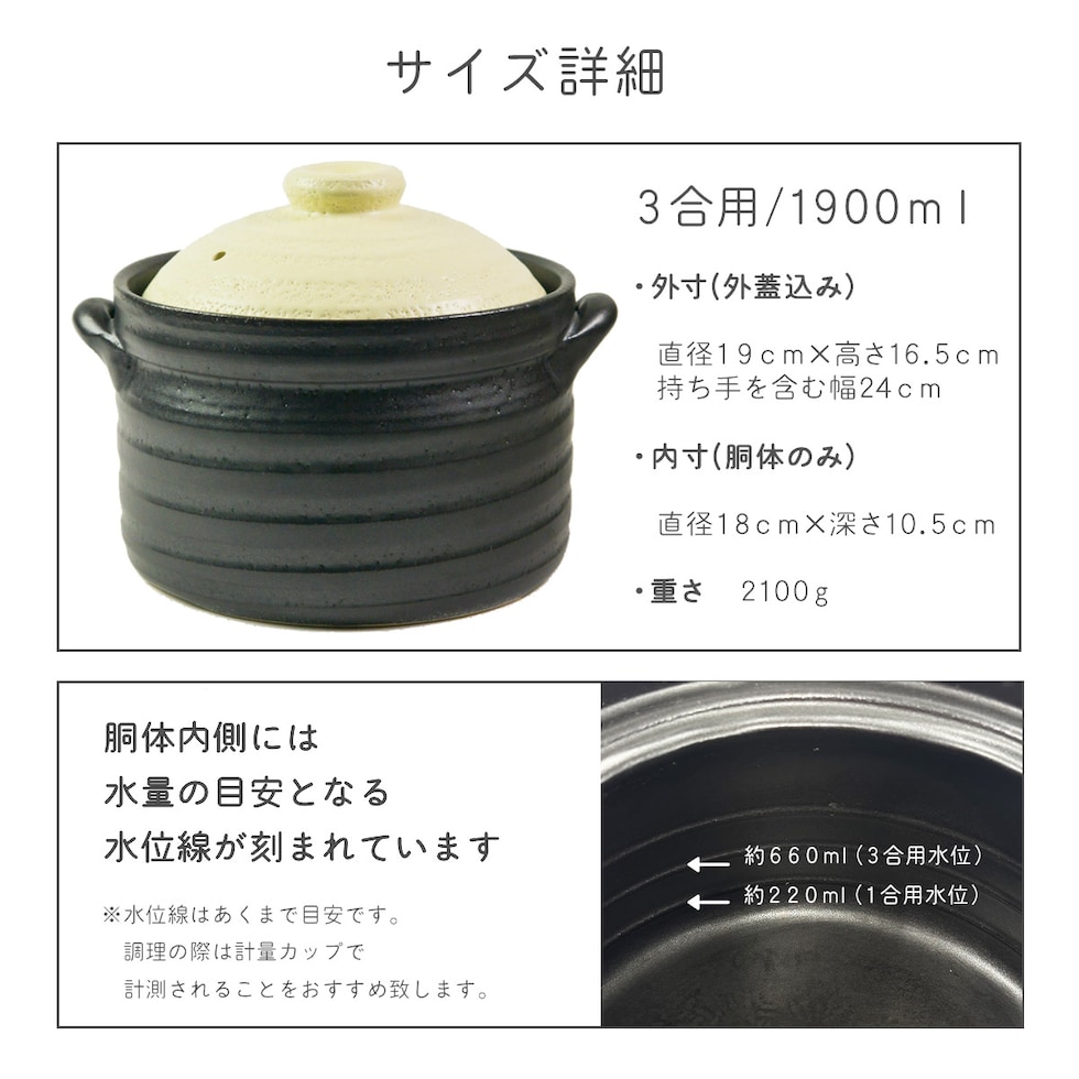 備考:[本体(蓋を含む全体)] IH対応:○、オーブン:○、電子レンジ:×、食器洗浄機:× [おひつ(蓋を含む全体)] 電子レンジ:○、食器洗浄機:○、直火対応:△