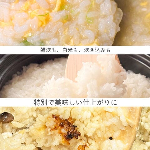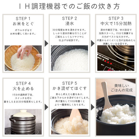 ※取り扱い説明書に記載の炊き方はあくまで目安となります。ガス・IH機器のメーカー・使用年数によって火力が異なりますので、お好みの炊き上がりとなるよう、ご自身で火加減の調整をしていただけますと幸いです。