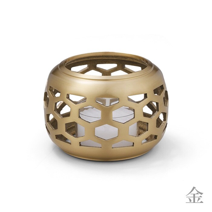 高岡銅器に約400年受け継がれてきた亀甲透かし香炉の伝統工芸の技術を、現代の生活スタイルに合うようなキャンドルカバーにしました。亀甲は、古来から長寿・夫婦円満など縁起の良い柄として広く親しまれているので、長寿のお祝いや結婚記念の贈り物としてもおすすめです。