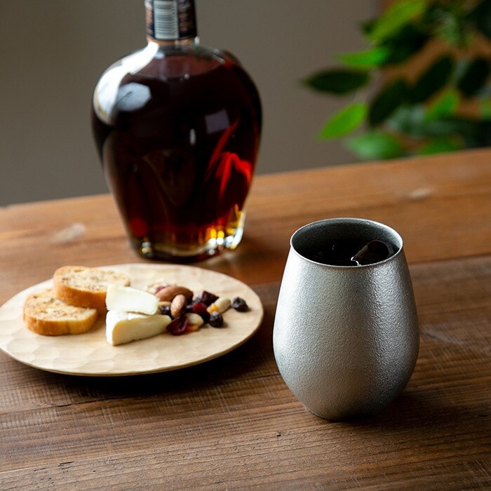 錫は古来より、「錫の器に入れた水は腐らない」、「お酒の雑味が抜けてまろやかになる」などといわれ、酒器や茶器などに用いられてきた金属。また、熱伝導率が高いので、冷酒を注ぐとその冷たさを瞬時に手肌で感じることができます。