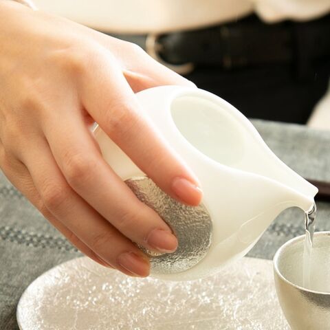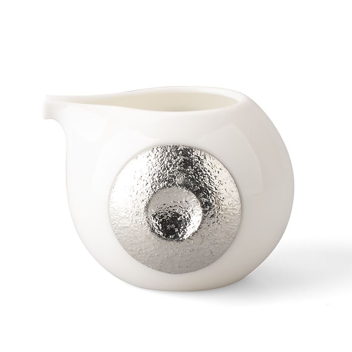 磁器と錫という異素材を組み合わせたユニークなデザインの片口です。