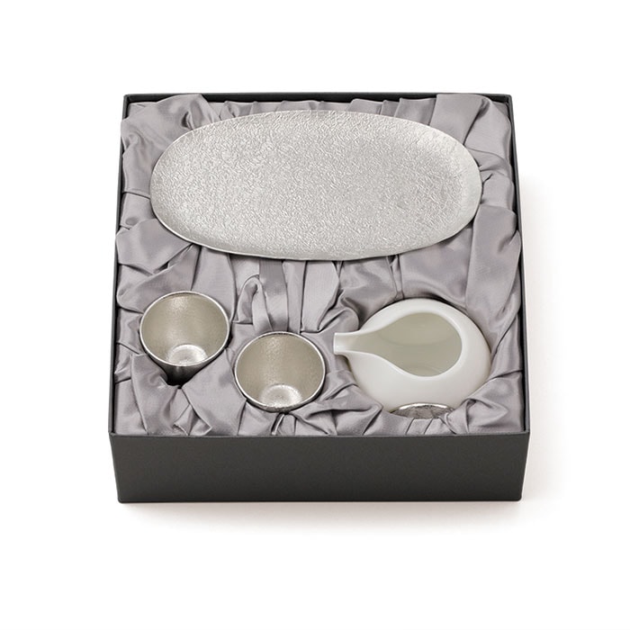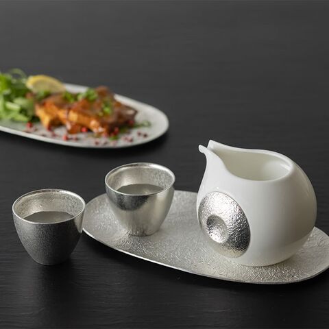 材質:[片口] 本体:磁器、持ち手:錫 [ぐい呑み] 本体:錫 [皿] 本体:錫