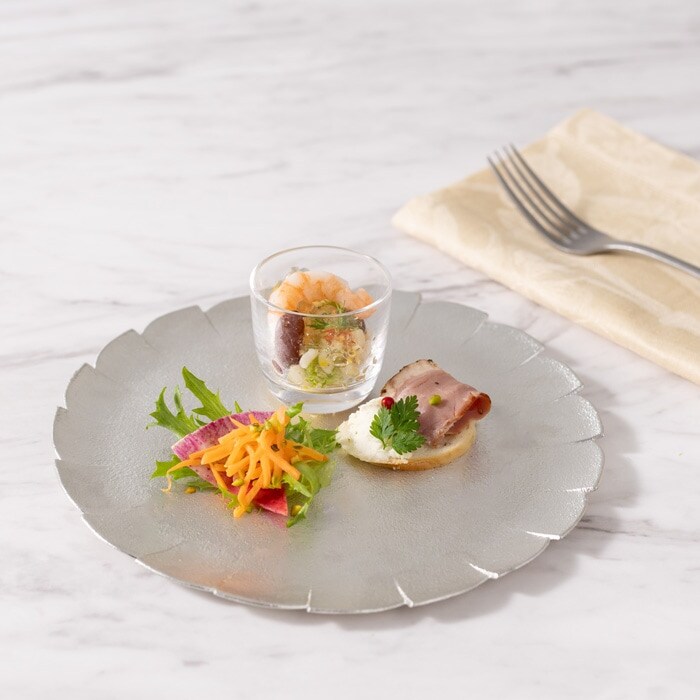 一つ一つ職人が手作業で仕上げています。錫は抗菌作用があるため、食器として安心してご使用いただけます。また、熱伝導率が高いため、冷蔵庫で器を1~11分冷やすだけで器全体がよく冷え、冷たいお料理を一層お楽しみいただけます。