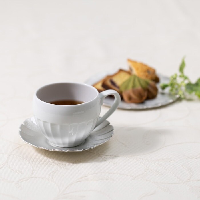錫と白磁の異素材のコラボレーションでありながら、優美なシルエットがとても美しく上品です。お好みの紅茶とスイーツを用意して、午後のひとときを優雅に彩るアフタヌーンティーをお楽しみください。