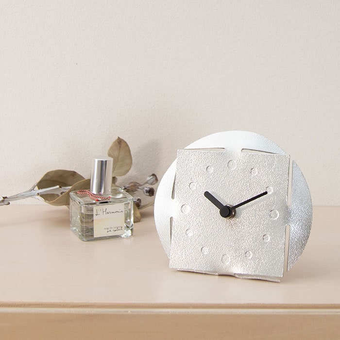 錫100%の特性であるやわらかさを最大限に生かし、四方それぞれ自由に形を変えることができます。 曲げ方によって時計が丸になったり、四角になったりと表情が変わり、自分だけのオリジナルの時計ができあがります。