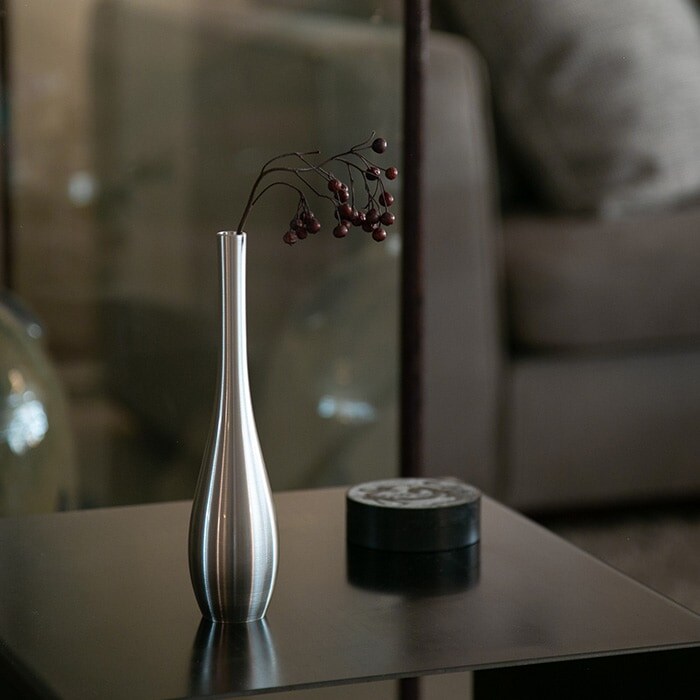 素材の美しさが際立つ真鍮製のフラワーベースです。そろりとは、古くから茶席の花入れとして使用されてきた花器のこと。能作では一品一品熟練した職人がロクロ仕上げを施すことで、金属の持つ美しさを最大限に引き出しました。