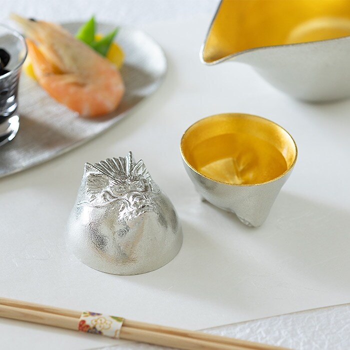 干支の動物をモチーフにした錫のぐい呑に金箔をあしらいました。